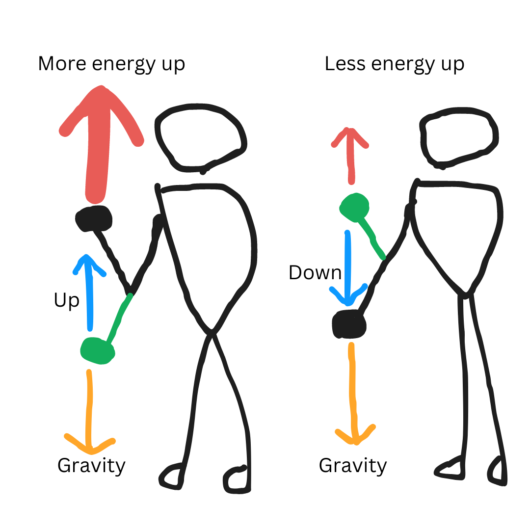 Be aware: When you lower the weight, you are only decreasing the energy up. You are resisting the pull of gravity less leading you to lower the weight. This results in less push upwards against the gravity making the weight lower.